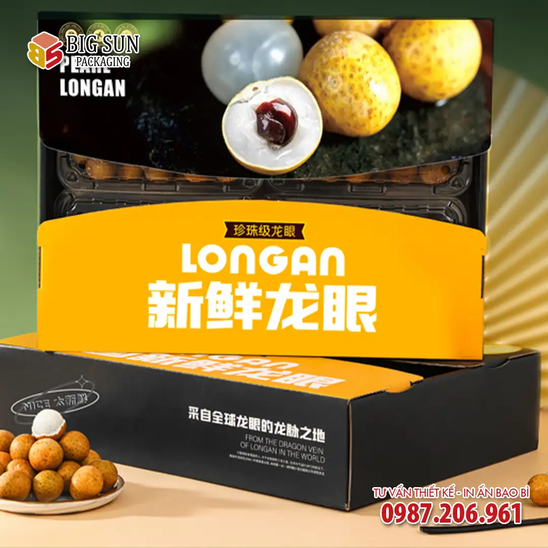 - Bảo vệ tuyệt đối: Cấu trúc bên trong sử dụng khay nhựa PET trong suốt được định hình sẵn. Khay nhựa này ôm trọn lấy từng trái nhãn (hoặc từng chùm nhỏ) giống như cách người ta nâng niu một viên ngọc quý. Cách đóng gói này giúp cố định sản phẩm, chống va đập và dập nát hiệu quả.