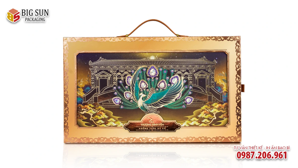 Mẫu hộp đựng yến Khổng Tước Uy Vũ được Big Sun lựa chọn gam màu trầm ấm làm chủ đạo, điểm xuyết thêm sắc xanh đậm nhằm tạo cảm giác vững chãi, điềm tĩnh và trang trọng. Big Sun cũng khéo léo tô điểm các chi tiết ánh kim vàng để tạo điểm nhấn, tượng trưng cho sự sung túc, thịnh vượng và giá trị bền vững.