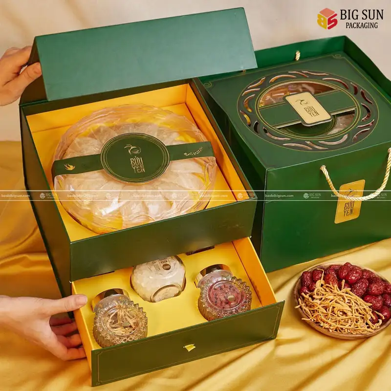 - Kết cấu hộp cứng cáp: Thường sử dụng kết cấu hộp âm dương hoặc hộp nắp gập có nam châm, tạo sự chắc chắn, bảo vệ tổ yến bên trong một cách an toàn tuyệt đối.