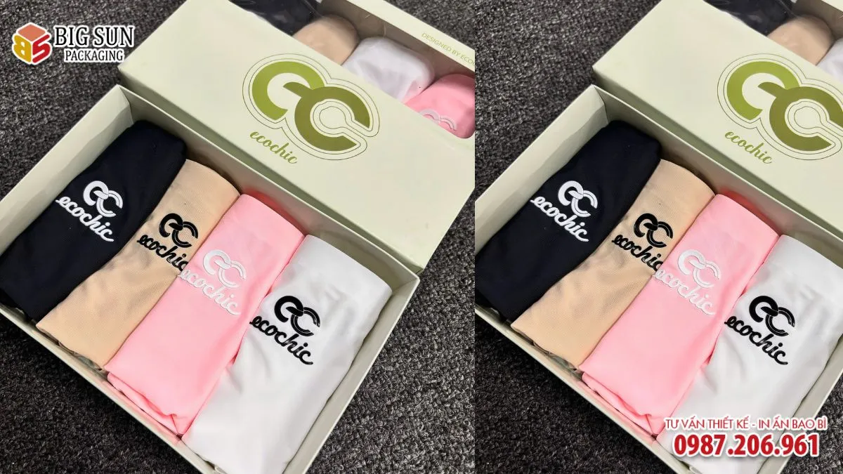 Mẫu hộp quà tặng thương hiệu Ecochic được thiết kế theo dạng hộp nắp mở truyền thống hoặc hộp bao diêm, phù hợp để đóng gói các set đồ lót, tất hoặc phụ kiện nhỏ. Kích thước hộp được tính toán để chứa vừa vặn 4 sản phẩm (4 packs), giúp tối ưu hóa không gian trưng bày và vận chuyển.