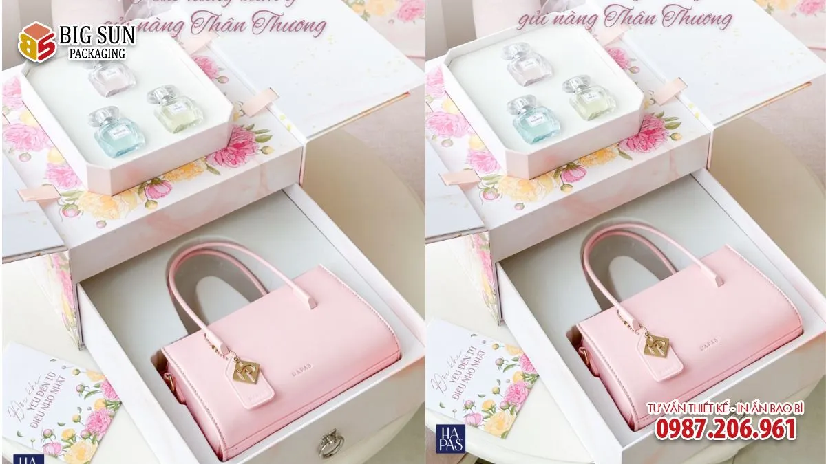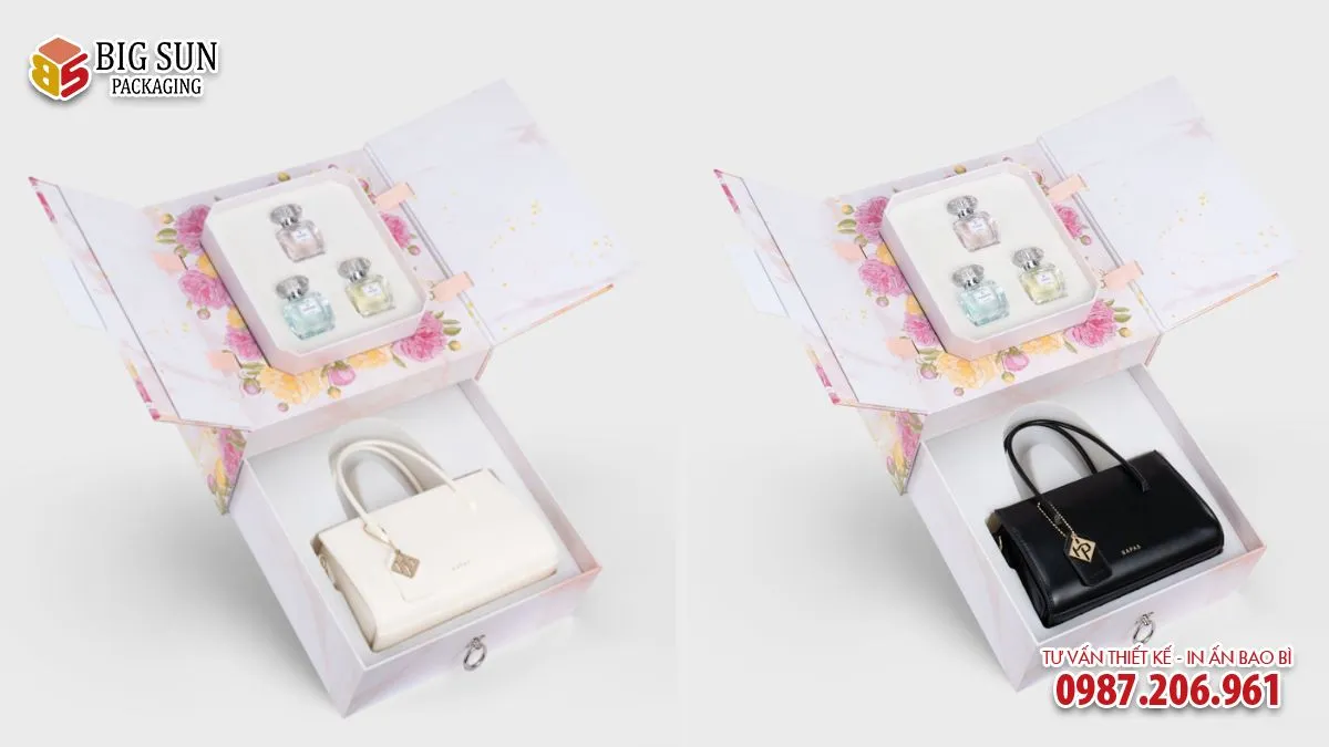 Khay định hình (Insert) chuyên dụng: Bên trong hộp được trang bị khay bế mút xốp hoặc giấy cao cấp, cắt định hình chính xác theo form dáng của túi xách và nước hoa. Điều này đảm bảo món quà luôn ở vị trí trung tâm, đẹp mắt và không bị xô lệch khi di chuyển.