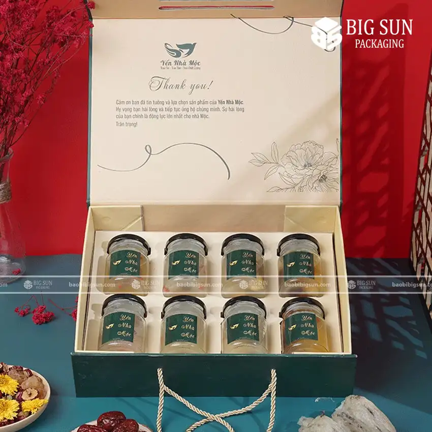 Nâng tầm giá trị sản phẩm Yến Nhà Mộc với dịch vụ in hộp quà yến chuyên nghiệp tại Big Sun Packaging. Chúng tôi mang đến giải pháp in ấn hộp quà yến tinh tế, sang trọng, giúp bảo quản sản phẩm tối ưu và gây ấn tượng mạnh mẽ với khách hàng. Kinh nghiệm lâu năm trong ngành in ấn bao bì là cam kết của Big Sun cho chất lượng sản phẩm cao cấp, thiết kế độc đáo và giá cả cạnh tranh.