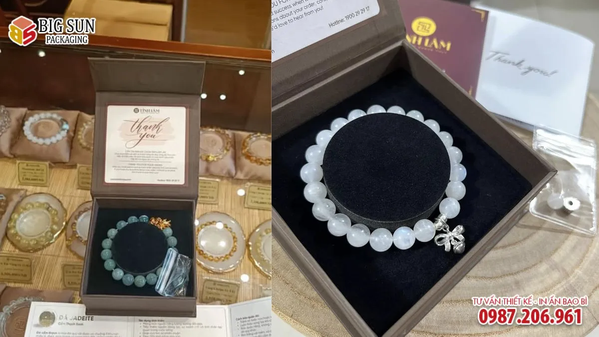 Hộp vòng tay Tinh Lâm thường có dạng hình vuông gọn gàng. Quy cách nắp đậy khít khao tạo ra áp suất nhẹ khi mở, mang lại cảm giác cao cấp. Cách bố trí logo ở ngay chính diện trung tâm nắp hộp giúp khẳng định chủ quyền thương hiệu một cách mạnh mẽ nhưng vẫn rất khiêm nhường.
