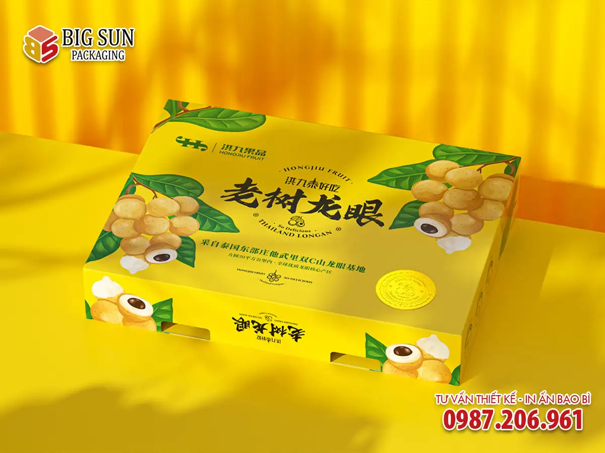 Công nghệ in Offset hiện đại đảm bảo mọi chi tiết, từ đường nét của cành lá đến màu sắc của quả nhãn, đều được tái hiện một cách chân thực và sắc nét. Kỹ thuật gia công sau in như cán màng bảo vệ, và đặc biệt là ép kim logo và tem nhãn, đã tạo ra điểm nhấn đắt giá, giúp sản phẩm thực sự nổi bật và khác biệt.